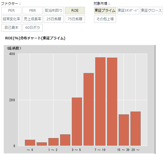 さて、以下のグラフは、株マップ.comのファクター分布チャートのROEのチャートです。