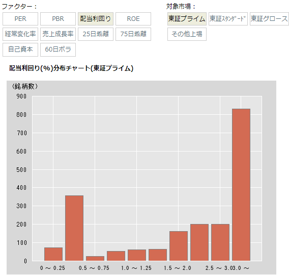 続いて、配当利回りの分布です。一番右の3.0%以上が800社超となっており、予想配当利回りが3%を超える銘柄がかなり多くなっていることが分かります。